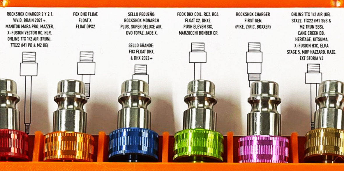 Para las suspensiones Fox, Ohlins, RockShox, Marzocchi, DVO, Manitou, CaneCreek, X-Fusion y muchas más, abarcamos con estos adaptadores las suspensiones más utilizadas en el mundo de MTB. Los adaptadores son un complemento indispensable de tu Máquina de Vacio.